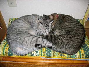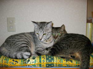 新しいねむねむの点検もし、どうするかな?と見ていましたら15分後には2匹仲良く並んで寝ていました。(でも、本当は場所取り合いのにらみ合い)結局・・・しろちびがで〜ん・・・(あぁ悲しい・・・涙)くろちびは、テレビの上のゲロ防止のいつもの新聞紙の上へ・・・