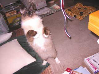 写真一枚目は「包装のリボンにハッスルするぽん太」