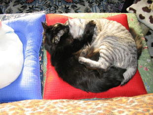 藤吉さんちのルイ君リュウちゃんクララちゃんユウヒちゃんです。レッドプロヴァンスとクルールシリーズのルージュとブルーでみんなで仲良くお昼寝中♪可愛い猫だまりのお写真です。