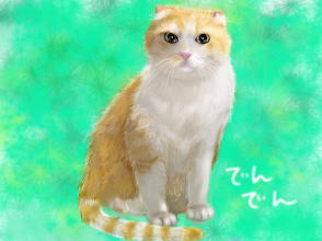 『でんでんの魅力を写真以上にふくらませて描いていただき、感激しています。初めて見た人が、必ず笑ってしまう変わったネコですが、ちょうど肖像画を描いていただいている時は、結石で入院中でした。