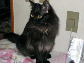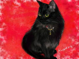 『素敵で感激しています。初めての写メールですごいプレゼントを頂いてしまって、ほんとうにありがとうございました。クララは迷い猫なのではっきりした誕生日は分りませんが、1歳の素晴らしい記念になります。写真のままよりも、絵にして飾る方が雰囲気があっていいですね。リュウ、ルイ、ユウヒ、そして犬のリリも、そのうち描いて頂きたいと思っていますので宜しくお願いします。』